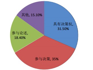 展會上其中具有決定權的占 31.5%,參與決策的占 35%,參與論述的占 18.4%,其它占15.1%。