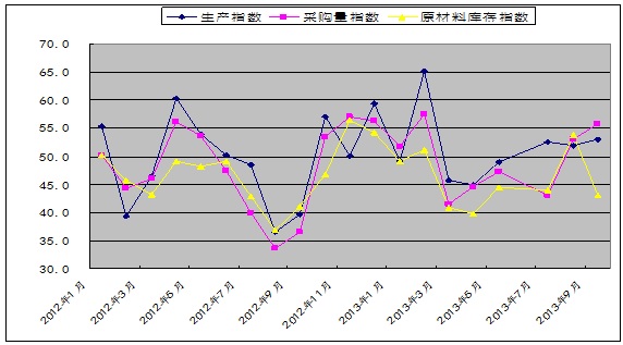 圖2:2012年以來鋼鐵行業PMI生產指數、采購量指數、原材料庫存指數變化情況