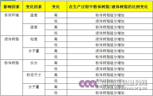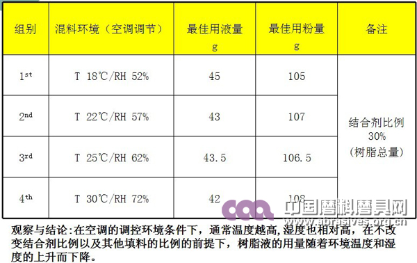 雖然混料過程中環境的影響可以通過調節粉液比來彌補從而獲得好的成型料,但是這種方法會導致砂輪質量的不穩定,所以砂輪生產過程中要保證粉液比不變這一點非常重要,同時對生產工作環境要嚴格控制。