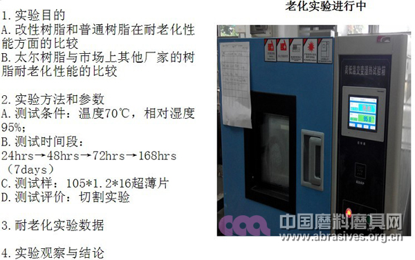 3).樹脂液改性可以提高(如:太爾的改性樹脂5712G)砂輪產品的耐老化性能,并且在超薄片產品的切割性能評價對比上得到驗證。