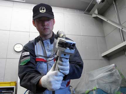 損傷中也有不少是肉眼難以發現的。比如微小的損傷和部件內部的損傷。這些要采用“非破壞性檢查”的方法進行檢查。筆者參觀了其中之一——“熒光滲透探傷法”的工作現場。