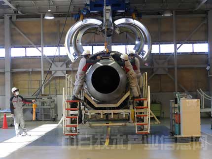 最終組裝好的發動機重約5噸。用起重機吊起后,運送到最后一道工序“調試”的現場。