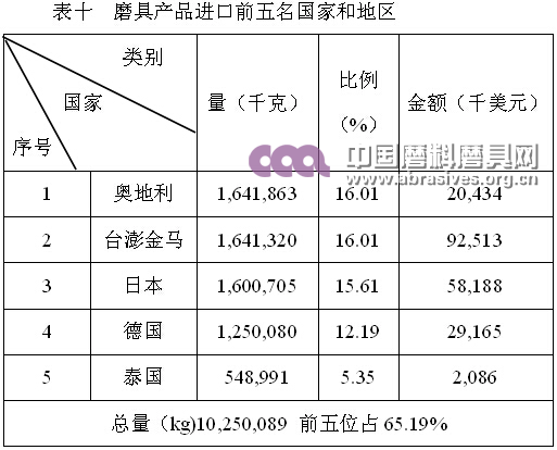 磨具進口量同比上升13.75%,金額同比上升54.48%,均價同比上升35.79%(表四-表十一)