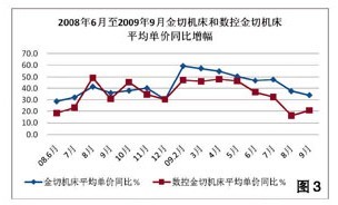 圖3顯示出:從2008年下半年開始至2009年9月份,機床平均單價增速在加快,特別是2009年上半年,比一年前平均增加了10多個百分點。