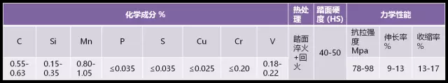 日本早期的車輪(包括新干線)所用材料STY80是碳含量為0.60%~ 0.75%的高碳鋼。在高速行駛時,該鋼的抗裂損性能不夠。為了提高車輪在高速運行時的抗裂損性能,日本研究人員開發了降低碳并加入釩的鋼,稱之為V2鋼(SVTY75-2R),其成分見下表: