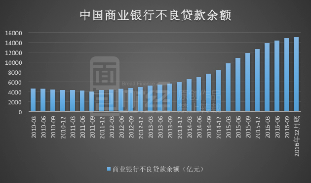 普遍認為,債轉股可以降低銀行當前總額龐大的不良貸款。據中國銀監會數據,2016年第四季度,商業銀行不良率出現5年來首度下滑;但不良貸款總額攀升速度迅猛,截至2016年12月底,中國商業銀行不良貸款余額已高達15122億,與2014年底相比,猛增了接近八成。下圖為面包財經根據中國銀監會數據繪制的中國商業銀行不良貸款余額: