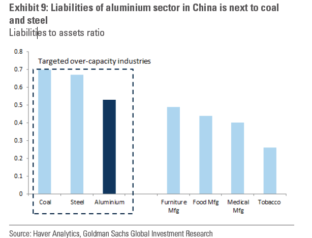高盛研究顯示,鋁行業是繼鋼鐵、煤炭和化工行業后,壞賬問題最嚴重的一個行業,其中鋁行業的杠桿率僅次于鋼鐵和煤炭行業。而在過去兩年,這三個行業都相繼經歷了供給側改革。