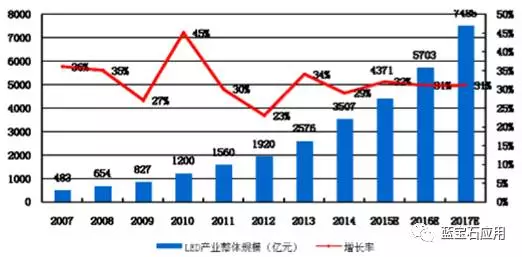 根據國家半導體照明工程研發及產業聯盟統計數據 2007 年至 2014 年期間,我國半導體照明產業整體規模從 483 億元增長至 3,507 億元,年均復合增長率為32.70%,預計至 2017 年,中國半導體照明產業市場規模將達到 7,485 億元,年均復合增長率為 28.50%。