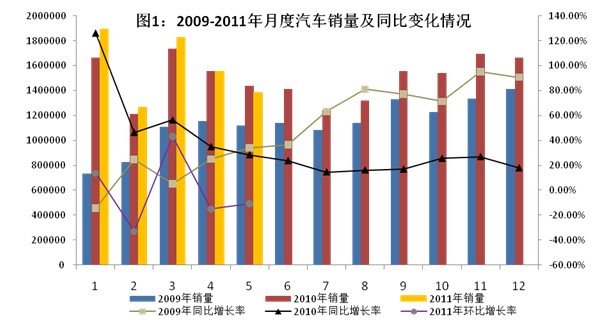 2011年5月,我國汽車產銷量同比、環比繼續負增長。