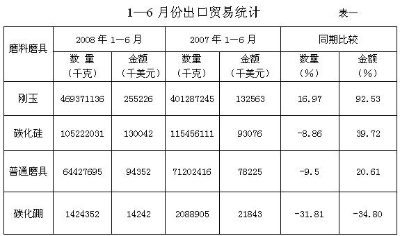 我們行業的產品,尤其是磨料產品,對出口的依賴性較強,國際市場需求變化,對產品出口影響較大。由于以上的原因,08年上半年產品出口量和出口額增幅較大,據海關統計,2008年,我國普通磨料磨具出口總額為10.9億美元,比上年增長47.17%。1-6月份各類產品出口量和創匯額分別為:剛玉出口量46.9萬噸,創匯2.55億美元,同比增長分別為16.97%和92.53%;碳化硅出口量10.5萬噸,創匯1.3億美元,同比增長分別為-8.86%和39.7%;普通磨具出口量為6.4萬噸,創匯9400萬美元,同比增長分別為-9.51%和20.6%(附表一)