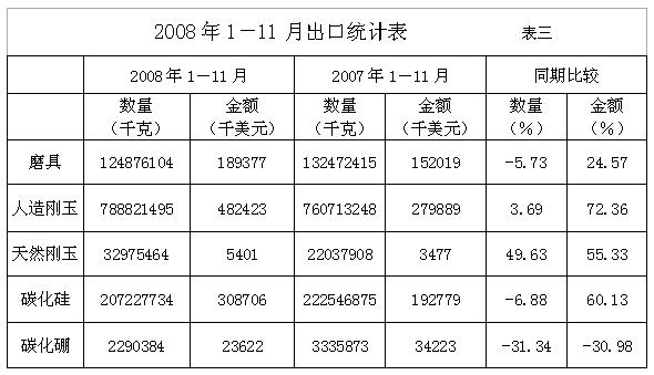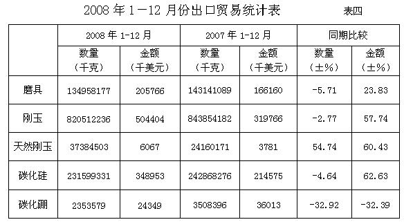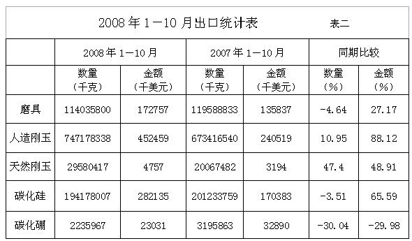 9月,美國“華爾街風暴”席卷全球,世界經濟形勢急轉直下,這進一步惡化了中國出口環境,各行業出口都受到了嚴重影響,12月1日國家對棕剛玉加收15%出口關稅,使棕剛玉出口受到了較大影響,第四季度下滑更為明顯。據海關統計:1-10月份出口情況(表二)、1-11月份出口情況(表三)、1-12月份總的情況為(表四)