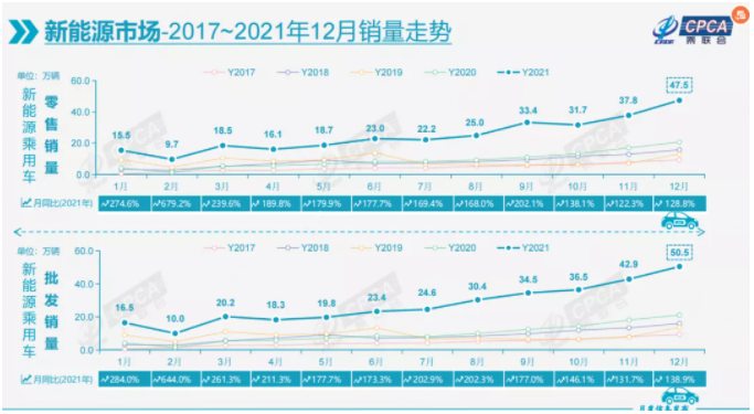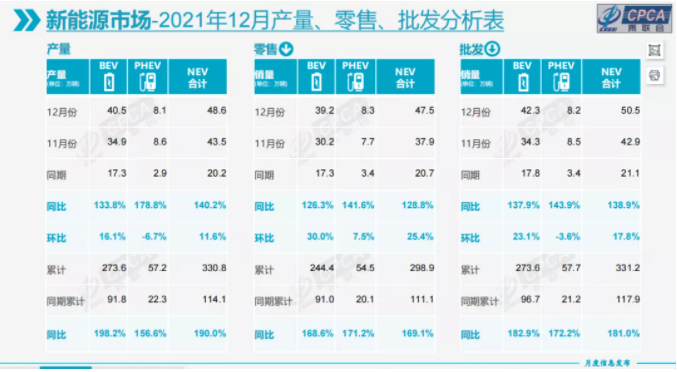 2022年(nian)1月(yue)(yue)11日,乘聯(lian)會舉行12月(yue)(yue)份的(de)線(xian)上(shang)發布會,公布了12月(yue)(yue)份和全(quan)年(nian)新能源汽車的(de)銷量(liang)數據,并對2022年(nian)市場做(zuo)了預(yu)測。新能源乘用(yong)車銷量(liang)從原(yuan)來480萬輛(liang)(liang)的(de)預(yu)測上(shang)調到了550萬輛(liang)(liang)。