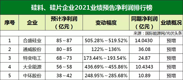 這其(qi)中(zhong)合(he)盛硅業(ye)表現最(zui)為搶眼,2021年預計實(shi)現凈利潤85~87億(yi)元,與上(shang)年同期(qi)相比(bi)漲(zhang)(zhang)幅高達505.28%~519.52%。其(qi)在77家光伏企業(ye)中(zhong)凈利潤最(zui)多,漲(zhang)(zhang)幅最(zui)高。緊隨(sui)其(qi)后的便(bian)是另一家硅料(liao)巨頭大(da)全能(neng)源,在預增公告內(nei),大(da)全能(neng)源將業(ye)績上(shang)漲(zhang)(zhang)的主要原因歸納為“高純多晶硅料(liao)環(huan)節(jie)整體供(gong)應(ying)緊缺(que),導致價格持續上(shang)漲(zhang)(zhang)。報(bao)告期(qi)內(nei),公司保持滿(man)負荷(he)生產、產銷量均比(bi)去年同期(qi)有所增加、因此(ci)實(shi)現業(ye)績顯著(zhu)增長”。