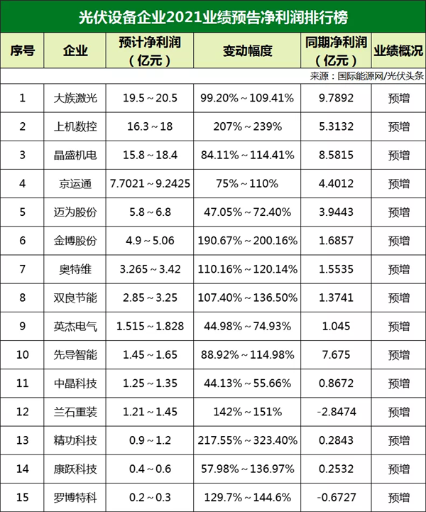 其中凈(jing)利(li)潤增長最多的(de)為(wei)大(da)族(zu)(zu)激(ji)光(guang)(guang),2021年預(yu)計凈(jing)利(li)潤在(zai)19.5~20.5億元之間,增幅(fu)在(zai)99.20%~109.41%之間。大(da)族(zu)(zu)激(ji)光(guang)(guang)主營(ying)激(ji)光(guang)(guang)技術設(she)(she)備,為(wei)光(guang)(guang)伏行業提(ti)供專(zhuan)用(yong)設(she)(she)備和解決方(fang)案。大(da)族(zu)(zu)激(ji)光(guang)(guang)業績(ji)預(yu)告(gao)中提(ti)到,公司持續加大(da)行業專(zhuan)用(yong)設(she)(she)備業務(wu)(wu)的(de)研(yan)發和投入,PCB行業專(zhuan)用(yong)設(she)(she)備、新能(neng)源動力電池行業專(zhuan)用(yong)設(she)(she)備、Miniled專(zhuan)用(yong)設(she)(she)備、Led封裝設(she)(she)備等業務(wu)(wu)訂(ding)單(dan)及發貨均較上(shang)年大(da)幅(fu)增長。