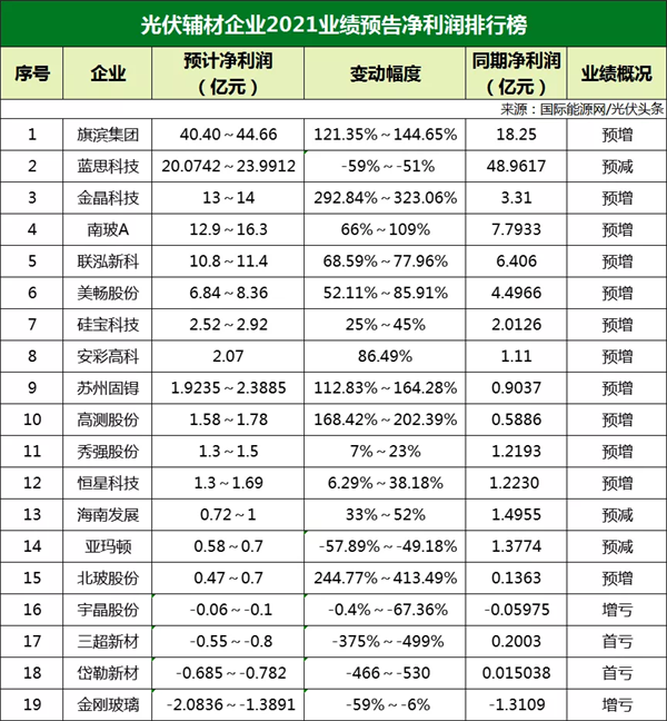 在(zai)19家光伏輔材企業(ye)中,凈(jing)利(li)潤增(zeng)長(chang)幅度最大的是金晶科技凈(jing)利(li)潤為13億(yi)元~14億(yi)元,與上年同期相比預計增(zeng)加9.69億(yi)元~10.69億(yi)元,同比增(zeng)加292.84%~323.06%。對于增(zeng)長(chang)原(yuan)因,金晶科技表示:“2021年玻璃、純堿(jian)價(jia)格上升(sheng)、公司銷售結構調整,公司主要產品毛利(li)率上升(sheng),同時,公司強化(hua)經營(ying)管理,產品銷售實現量價(jia)齊升(sheng),為公司整體(ti)盈利(li)水平帶來(lai)較大增(zeng)長(chang)。”
