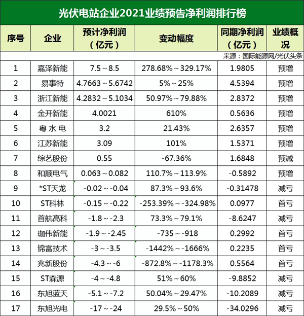 2021年由于光伏產(chan)業鏈上游(you)價格暴漲(zhang),導致光伏產(chan)業鏈末端的(de)光伏企業承受了很大壓力,光伏新增裝(zhuang)機不及預(yu)期。這直接反映在電站(zhan)企業的(de)財務報告中(zhong)。17家(jia)(jia)與(yu)光伏電站(zhan)相關的(de)企業8家(jia)(jia)凈(jing)利潤為正(zheng)值,9家(jia)(jia)處于虧損(sun)狀態。