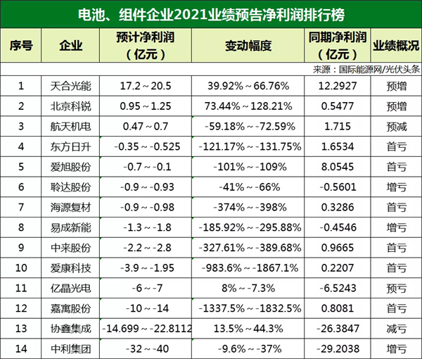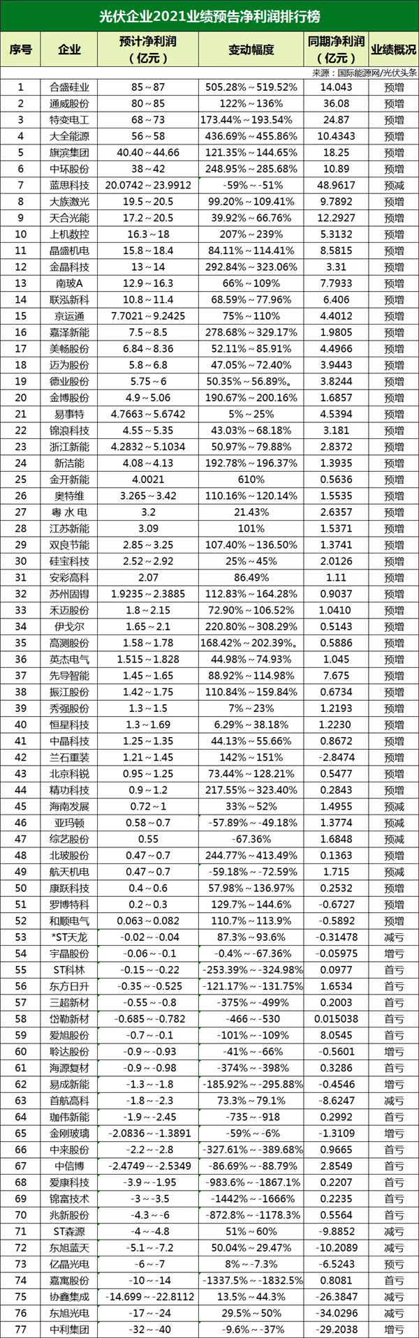 近期(qi),上市企業(ye)陸續(xu)發布(bu)2021年業(ye)績預告,國際能源(yuan)網對(dui)其中77家光伏(fu)企業(ye)進行了統計,其中52家企業(ye)凈(jing)利潤實現(xian)正(zheng)增長,占(zhan)67.5%,25家企業(ye)凈(jing)利潤為負值,占(zhan)比達到32.5%。那么2021年光伏(fu)行業(ye)哪些(xie)(xie)領(ling)域最賺錢,又有哪些(xie)(xie)板(ban)塊站(zhan)在風口卻賠錢呢?