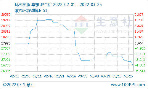 本周環氧樹脂市(shi)場(chang)走(zou)跌下行為主,需(xu)求低迷且原料(liao)持續走(zou)跌,成本面利空(kong)疊加(jia)需(xu)求不佳周內(nei)環(huan)氧樹脂(zhi)市(shi)場(chang)重心走(zou)跌。 據生意社監(jian)測數據顯(xian)示,3月(yue)18日(ri)華東地區(qu)液體環(huan)氧樹脂(zhi)市(shi)場(chang)報盤在26300元/噸,3月(yue)25日(ri)市(shi)場(chang)跌至25300元/噸。