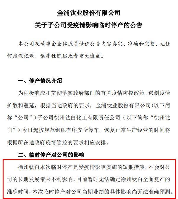 4月1日(ri)晚間,金浦鈦業公告表示,子公司(si)(si)徐(xu)州(zhou)鈦白(bai)化工有限責任公司(si)(si)今(jin)日(ri)起(qi)按規范組織有序安全(quan)(quan)停(ting)車。恢(hui)復正常生產(chan)經營(ying)的(de)時間將(jiang)根(gen)據(ju)所在地政府疫(yi)情管(guan)控(kong)的(de)要求相應安排。徐(xu)州(zhou)鈦白(bai)本(ben)次(ci)臨時停(ting)產(chan)是受疫(yi)情影(ying)響實施(shi)(shi)的(de)短期措施(shi)(shi),不會對公司(si)(si)的(de)長期發展帶來不利影(ying)響。目前暫時無法確(que)定徐(xu)州(zhou)鈦白(bai)全(quan)(quan)面復產(chan)的(de)準(zhun)確(que)時間,本(ben)次(ci)臨時停(ting)產(chan)對公司(si)(si)當期業績的(de)具體影(ying)響尚無法準(zhun)確(que)預測。
