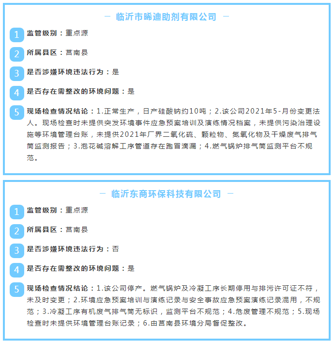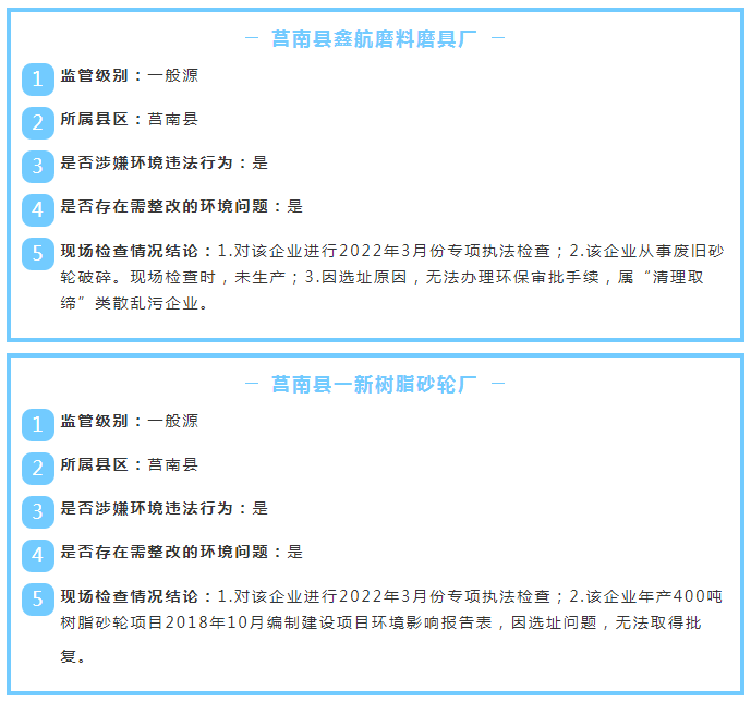 4月24日,臨沂市生態環境局通報3月專項執法開展情況,莒南6家存在問題企業被曝光,其中包含兩家磨料磨具相關企業: