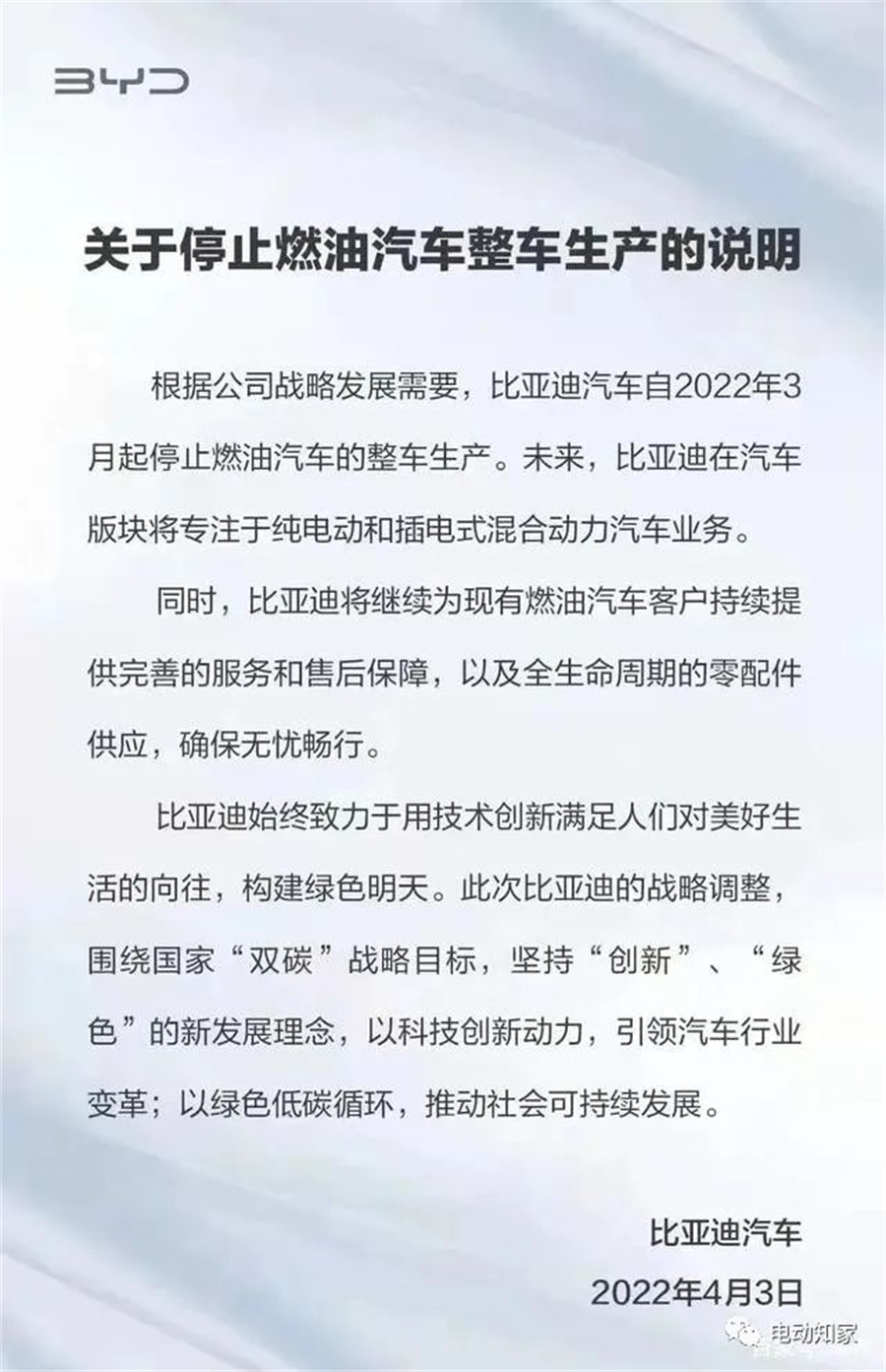 今年4月3日,比亞迪發布公告稱(cheng):根據公司(si)戰略發展需要(yao),公司(si)自2022年3月起停止燃油(you)(you)汽車(che)(che)(che)的(de)整車(che)(che)(che)生產(chan)。未來,在(zai)汽車(che)(che)(che)板塊,公司(si)將(jiang)專注于純電動和插電式混合(he)動力汽車(che)(che)(che)業務(wu)。同時,公司(si)將(jiang)繼續進行(xing)燃油(you)(you)汽車(che)(che)(che)零部件(jian)的(de)生產(chan)和供應(ying),為現有燃油(you)(you)汽車(che)(che)(che)客戶持(chi)續提供完善的(de)服(fu)務(wu)和售(shou)后保障,以及全(quan)生命周期(qi)的(de)零配件(jian)供應(ying),保證無憂暢行(xing)。