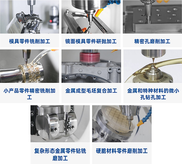 在需求牽引下,北京精雕經過多年的發展,持續圍繞高端數控機床加大研發投入,旗艦產品精雕高速加工中心已經形成了系列化的產品,具備穩定實現“0.1微米進給、1微米切削,納米級表面效果”的極致制造能力,其技術性能處于國際先進水平,應用能力達到國際領先。憑借精雕機的精密加工能力、合理的軟硬件配置以及成熟的“精雕精密加工解決方案”,精雕機被廣泛應用至模具零件銑削、鏡面模具零件研拋、精密孔磨削、小產品零件精密銑削、金屬成型毛坯復合加工、微小孔鉆孔、復雜形態金屬硬料鉆銑磨、硬脆材料研磨加工等多個領域。模具零件銑削加工:穩定實現2-15μm精度的模具零件銑削加工,實現模具裝配“只配不修”; 鏡面模具零件研拋加工:面型精度達到微米級,表面粗糙度小于10nm,呈現鏡面效果;精密孔磨削加工:穩定實現2-5μm加工精度的高精度孔磨削;小產品零件精密銑削加工:穩定實現2-15μm加工精度,滿足復雜形態精密小產品零件的生產要求;金屬成型毛坯復合加工:基本加工精度小于20微米成型毛坯鉆銑鏜磨復合加工;金屬和特種材料的微小孔鉆孔加工:穩定實現多種難切削材料的微小孔鉆孔加工,微孔加工快、準、穩;復雜形態金屬零件鉆銑磨加工:穩定實現硬度HRC50以上的復雜形態零件鉆銑磨精密加工;硬脆材料零件磨削加工:穩定實現尺寸精度要求<5μm的復雜形態特種脆硬材料零件磨削加工。