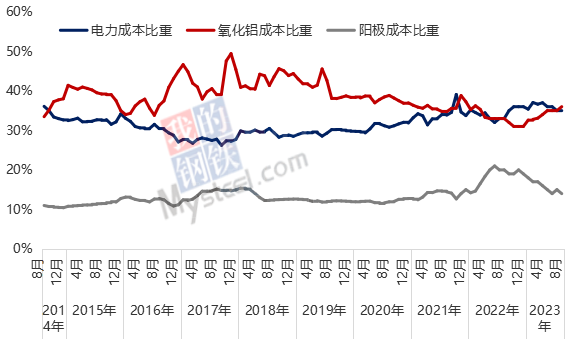 綜上,電解(jie)鋁(lv)各(ge)成本項中(zhong),電力(li)成本比重(zhong)為(wei)35%,氧(yang)化鋁(lv)成本比重(zhong)為(wei)36%,陽(yang)極成本比重(zhong)為(wei)14%,整體波(bo)動不(bu)大。