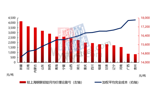 8月電(dian)解鋁(lv)(lv)行(xing)業地區(qu)(qu)(qu)間(jian)成(cheng)本(ben)(ben)差(cha)異(yi)有所縮窄,貴州(zhou)仍然是成(cheng)本(ben)(ben)最(zui)高(gao)的(de)省份。與成(cheng)本(ben)(ben)最(zui)低(di)的(de)新疆相比(bi),成(cheng)本(ben)(ben)差(cha)異(yi)為4842元/噸(dun),受氧(yang)化鋁(lv)(lv)價格上漲影響,成(cheng)本(ben)(ben)兩端差(cha)值(zhi)環比(bi)收(shou)窄160元/噸(dun)。電(dian)力成(cheng)本(ben)(ben)優(you)勢(shi)(shi)地區(qu)(qu)(qu)依(yi)舊(jiu)是電(dian)解鋁(lv)(lv)廠成(cheng)本(ben)(ben)優(you)勢(shi)(shi)最(zui)顯著的(de)地區(qu)(qu)(qu),比(bi)如新疆、云南及內蒙古,而受貨源(yuan)地坑口價變動(dong)不大影響,山東地區(qu)(qu)(qu)自備(bei)氧(yang)化鋁(lv)(lv)產能的(de)冶煉廠在(zai)氧(yang)化鋁(lv)(lv)價格上漲期間(jian)利(li)(li)潤水平也(ye)顯示優(you)勢(shi)(shi);另外、使用風(feng)力發(fa)電(dian)等清(qing)潔(jie)能源(yuan)的(de)寧夏(xia)青海也(ye)維持較高(gao)利(li)(li)潤水平。