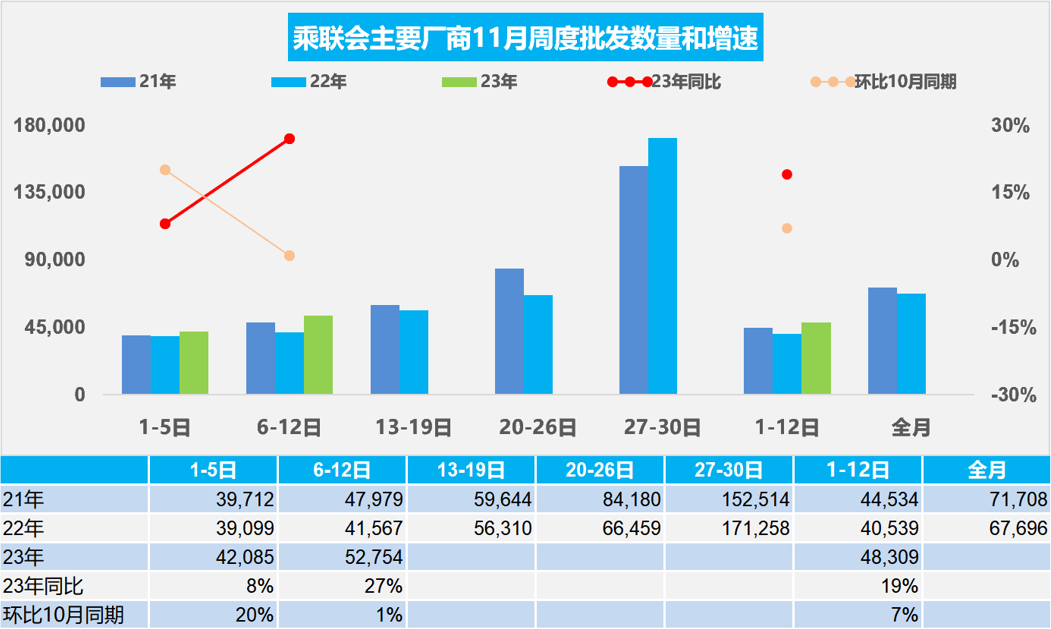 11月(yue)1-12日,全國乘用車廠(chang)商批發(fa)58.0萬輛(liang),同(tong)比(bi)去(qu)年(nian)同(tong)期增(zeng)(zeng)長19%,較上月(yue)同(tong)期增(zeng)(zeng)長7%;今(jin)年(nian)以來累計批發(fa)2,085.1萬輛(liang),同(tong)比(bi)增(zeng)(zeng)長7%。