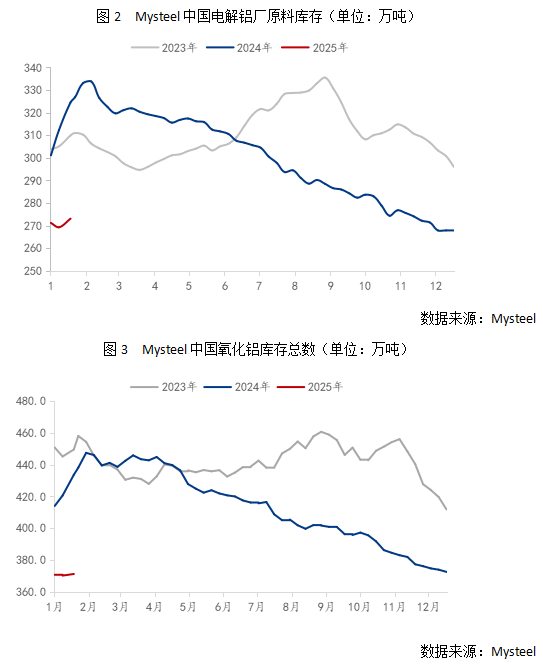 下游(you)鋁(lv)廠原(yuan)(yuan)料(liao)(liao)庫(ku)(ku)(ku)存(cun)(cun)堆積 壓(ya)(ya)價采(cai)購(gou)意愿明(ming)顯(xian)——年(nian)底前(qian)為了(le)執行(xing)前(qian)期(qi)拖欠的(de)長(chang)(chang)單,氧化鋁(lv)廠外購(gou)現(xian)貨交付(fu)長(chang)(chang)單,長(chang)(chang)單執行(xing)情(qing)況明(ming)顯(xian)好轉,導致電(dian)解鋁(lv)廠原(yuan)(yuan)料(liao)(liao)庫(ku)(ku)(ku)存(cun)(cun)出(chu)現(xian)小幅累(lei)庫(ku)(ku)(ku),但(dan)(dan)是整體(ti)(ti)庫(ku)(ku)(ku)存(cun)(cun)維持(chi)去庫(ku)(ku)(ku)走勢,供需(xu)依舊維持(chi)偏緊(jin)格局。但(dan)(dan)隨(sui)著供應(ying)端增量(liang)的(de)釋放(fang),在下游(you)鋁(lv)廠原(yuan)(yuan)料(liao)(liao)庫(ku)(ku)(ku)存(cun)(cun)堆積的(de)同時,整體(ti)(ti)庫(ku)(ku)(ku)存(cun)(cun)拐點(dian)出(chu)現(xian)。由(you)于鋁(lv)廠目(mu)前(qian)仍處于大面積虧損狀態,隨(sui)著原(yuan)(yuan)料(liao)(liao)保(bao)供壓(ya)(ya)力的(de)緩解,壓(ya)(ya)價采(cai)購(gou)意愿明(ming)顯(xian)增加。