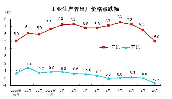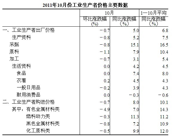 2011年10月份,全國工業生產者出廠價格比上月下降0.7%,比去年同月上漲5.0%。工業生產者購進價格比上月下降0.7%,比去年同月上漲8.0%。2011年1—10月,工業生產者出廠價格平均同比上漲6.8%,工業生產者購進價格平均同比上漲10.1%。