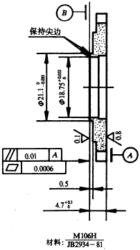 我單位生產的幾種航空輸油泵中都有以石墨M106H為材料的密封環類零件,其典型零件如下圖所示.此零件為端面密封工作方式,B面為密封面,此面精度要求很高.加工B面時,精密車削達不到要求,而此石墨為脆性材料,還含有環氧樹脂,又不能磨削,經分析決定采用研磨加工.在無資料借鑒的情況下,我們對此類石墨零件的研磨進行了工藝試驗,最后得出了較理想的工藝方法,達到了零件的要求。
