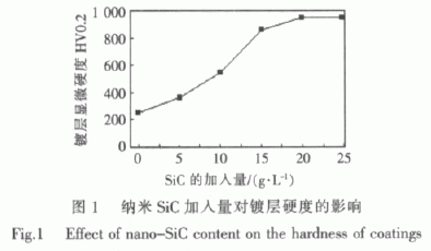 實驗結果表明, 改變鍍液中納米碳化硅的質量濃度, 鍍層硬度隨納米碳化硅的質量濃度的增加而增加。在碳化硅的質量濃度為 20 g/L 時硬度最大。這表明鍍液中粒子的質量濃度愈大, 輸送到陰極表面的顆粒愈多, 嵌入鍍層的的幾率愈大, 鍍層的性能愈好。但粒子的質量濃度有一個臨界值, 即 CSiC=20 g/L, 再增大加入量, 鍍層硬度不再增大。這是因為鍍液中微粒的含量達到一定值后, 微粒在鍍液中的無規則運動就會阻礙金屬離子向陰極的定向移動, 從而使鍍層中微粒的含量不再增大[4]。