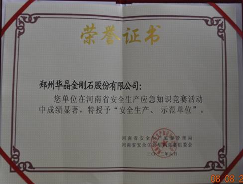 近日,鄭州華晶金剛石股份有限公司為認真落實《河南省人民政府關于加強安全生產應急管理工作的意見》(豫政〔2012〕55號),進一步增強公司安全生產意識,提高廣大職工群眾防災抗災能力,公司組織參加了河南省安全生產監督管理局和河南法制報社舉辦的以“普及應急知識,提高應急能力”為主題的第二屆河南省安全生產應急知識競賽活動。經周密組織,認真實施,華晶公司在競賽活動中成績顯著,被河南省安全生產監督管理局、河南省安全生產知識競賽組委會授予“安全生產示范單位”榮譽稱號。