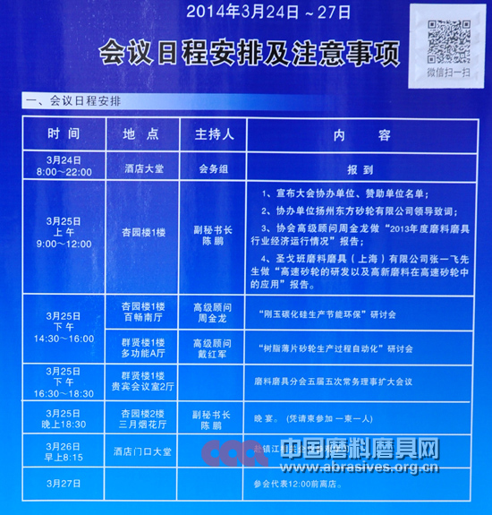 【中國磨料磨具網 訊】2014年3月24-27日,2014年春季全國磨料磨具行業信息交流暨第59屆剛玉碳化硅交易會在江蘇揚州舉行。23日,先期到達揚州會議中心的大會會務組已開始展開報到工作。