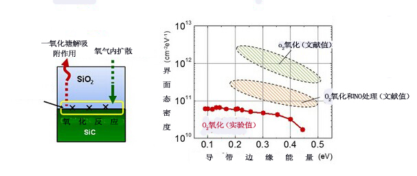 右圖是氧化硅和碳化硅界面的氧化反應。反應過程中用副產品碳的解吸附作用充當一氧化碳能夠有效降低界面缺陷的形成。左圖是4H-SiC和SiO2的界面態密度圖。水平軸顯示了碳化硅導帶邊緣缺陷態的能量級準。