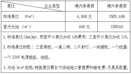 1.展會官網展示 2.會刊或宣傳資料免費刊登展商基本信息 3.公共區域清潔 4.現場保安 5.展會會刊 6.參展商證 7.VIP采購商證 8.展期免費午餐 9.免費穿梭巴士 10.展后報告(5、6、7、8項將依照參展面積分配)