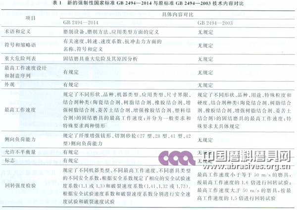 新的強制性國家標準GB 2494—2014《固結磨具 安全要求》與原國家標準GB 2494—2003《普通磨具 安全規則》技術內容對比見表1。