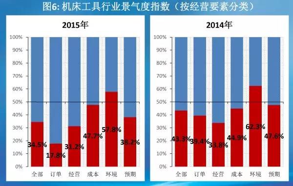 從分行業的景氣度情況看,2015年各分行業的景氣度指數均低于2014年。其中,金屬切削機床為36%,與2014年相比小幅下降3個百分點;金屬成形機床為33.3%,與2014年相比陡降30.4個百分點(降幅達47.7%);工量具為21.4%,與2014年相比陡降29.3個百分點(降幅達57.8%);功能部件和數控系統為31%,與2014年相比大幅下降15.8個百分點(降幅達33.8%)。景氣度指數下降幅度由大到小的排序分別是金屬成形機床、工量具、功能部件與數控系統和金屬切削機床。以上分行業指數和對比情況基本符合行業市場和經濟運行的實際趨勢。