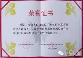 2016年5月中旬,河南省信用建設促進會、河南省企業信用評審委員會辦公室聯合發文公布了“2015年河南省信用建設示范單位”復審合格單位名單,河南易成新能源股份有限公司名列其中,順利通過“河南省信用建設示范單位”復審。據悉,河南省信用建設促進會、河南省企業信用評審委員會辦公室根據《河南省人民政府關于加快推進全省社會信用體系建設的通知》(豫政〔2009〕93號)和《河南省信用建設示范單位評定實施意見(試行)》,嚴格按照評定標準和程序,由企業自主申報,經省工商局、國稅局、地稅局、質監局、住房城鄉建設廳、人力資源社會保障廳、環保廳等部門審核,省企業信用評審委員會評審會議評審通過,最終確定了包括易成新能在內的32家“2015年河南省信用建設示范單位”復審合格單位名單。