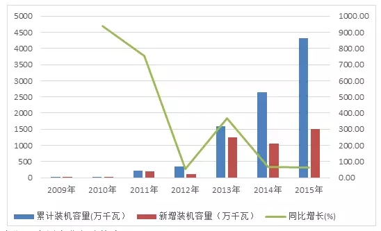 圖4 2009~2015年我國光伏發電裝機容量及增速
