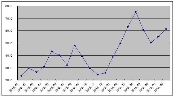 8月份,鋼鐵行業新訂單指數兩連升至52.1%,較上月回升1.6個百分點,顯示鋼鐵企業訂單組織良好。8月份雖行業處于傳統淡季,但鋼鐵企業銷售數據卻表現不俗,特別是流通環節備貨積極性提升,鋼廠接單量增加。中鋼協數據顯示,2016年8月中旬重點監測鋼鐵企業鋼材銷售結算量1547.14萬噸,日均銷售154.71萬噸,比上一旬日均增加16.42萬噸,增幅11.88%;本旬粗鋼銷售結算量60.96萬噸,日均銷售6.10萬噸,比上一旬日均增加0.13萬噸,增幅2.21%。