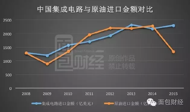 消耗量巨大,但由于自主芯片無法滿足要求,中國只能花巨資大量進口芯片,耗費的支出屢屢超過原油進口。下圖為面包財經根據海關總署數據繪制的中國集成電路與原油進口金額對比圖: