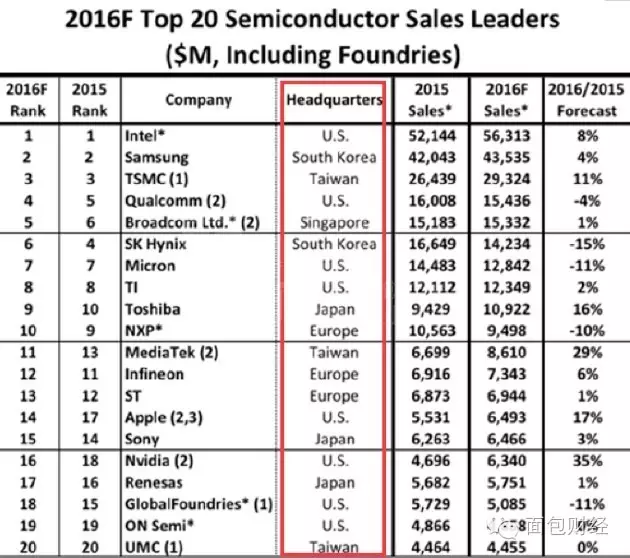 IC Insights的報告則更直觀的反映了這一事實。據該機構近日公布的全球前二十大芯片廠預估營收排名中,英特爾高居榜首,三星、臺積電、高通等緊隨其后。在前二十名芯片營收廠商中,美國占8席、日韓占5席,中國大陸無一家企業入圍。