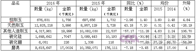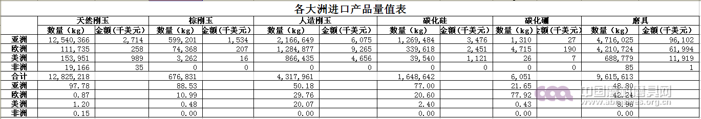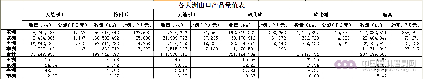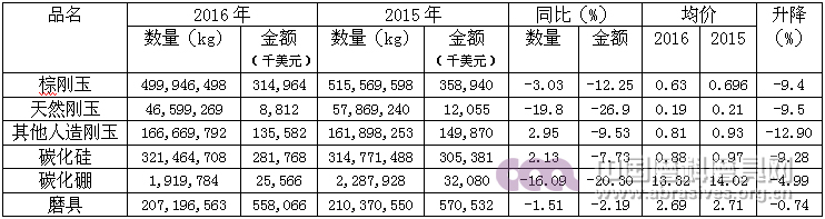 棕剛玉49.99萬噸,314,964千美元,同比分別降低3.03%,12.25%,均價降低9.4%;天然剛玉4.66萬噸,8812千美元,同比分別降低19.48%、26.9%,均價降低9.5%;其他人造剛玉16.67萬噸,135582千美元,同比量上升2.95%,金額下降9.53%,均價下降12.9%;碳化硅32.15萬噸,金額281768千美元,同比量上升2.13%,金額下降7.73%,均價下降9.28%;碳化硼1919.8噸,金額25566千美元,同比分別下降16.09%和20.3%,均價下降4.99%;磨具20.72萬噸,金額558066千美元,同比分別下降1.51%和2.19%,均價同比下降0.74%。