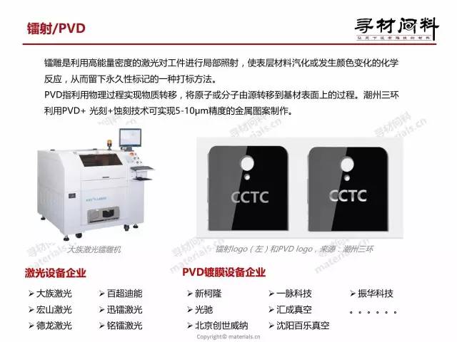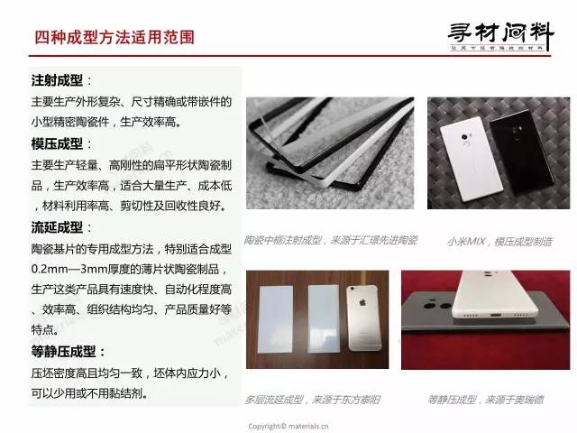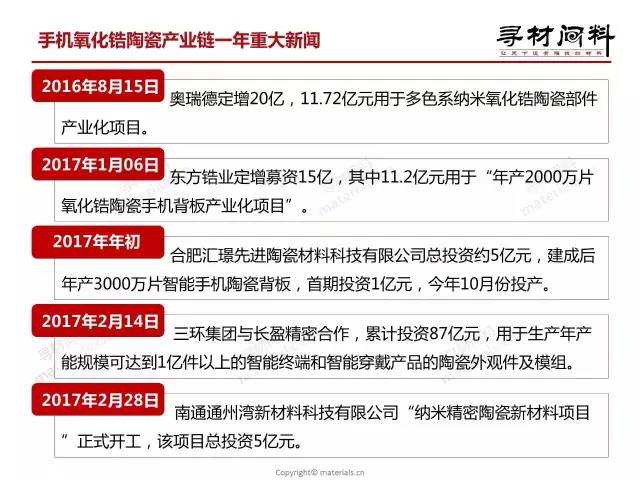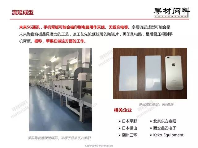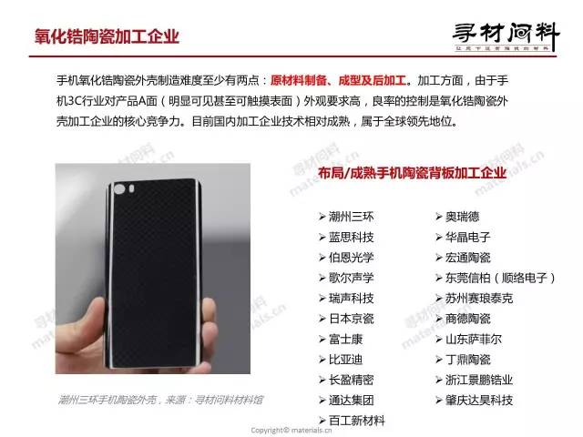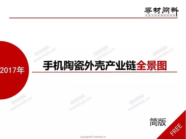 手機5G時代,非電磁屏蔽材料受益。陶瓷材料由于硬度高,可通過跌落測試(1.2米高),質感和顏色效果更佳,可做成一體式外殼等,尤其受到重視!近一年以來,三環集團、長盈精密、奧瑞德、東方鋯業、合肥匯璟、通州灣新材料等紛紛布局手機陶瓷外殼產業,手機陶瓷外殼將迎來春天?在此背景下,尋材問料制作了《2017最新手機陶瓷外殼產業鏈全景圖》,希望對您有幫助。PPT簡版主要分為四個部分: