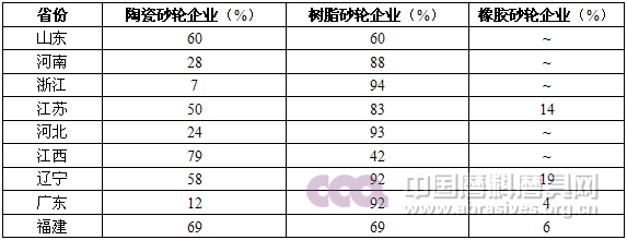 按陶瓷、樹脂、橡膠結合劑分類,山東省陶瓷砂輪生產企業占比60%,樹脂砂輪生產企業占比60%(說明:部分企業陶瓷、樹脂結合劑砂輪都能夠生產,下同);河南省陶瓷砂輪生產企業占比28%,樹脂砂輪生產企業占比88%;浙江省陶瓷砂輪生產企業占比7%,樹脂砂輪生產企業占比94%;江蘇省陶瓷砂輪生產企業占比50%,樹脂砂輪生產企業占比83%,橡膠砂輪生產企業占比14%;河北省陶瓷砂輪生產企業占比24%,樹脂砂輪生產企業占比93%;江西省陶瓷砂輪生產企業占比79%,樹脂砂輪生產企業占比42%;遼寧省陶瓷砂輪生產企業占比58%,樹脂砂輪生產企業占比92%,橡膠砂輪生產企業占比19%;廣東省陶瓷砂輪生產企業占比12%,樹脂砂輪生產企業占比92%,橡膠砂輪生產企業占比4%;福建省陶瓷砂輪生產企業占比69%,樹脂砂輪生產企業占比69%,橡膠砂輪生產企業占比6%