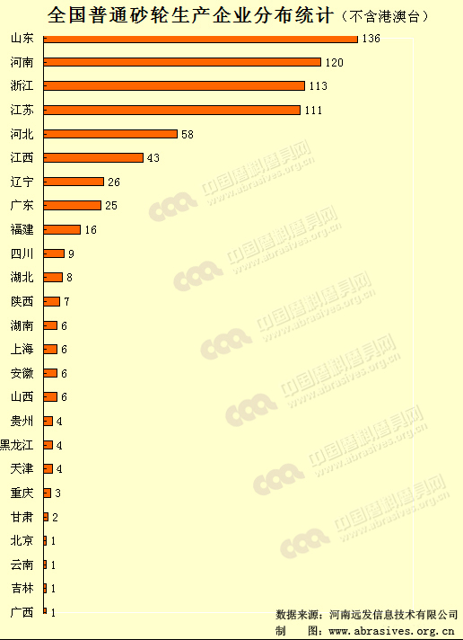截至2017年5月全國普通砂輪生產企業區域分布情況:按省份統計,山東、河南、浙江、江蘇四省為第一梯隊,砂輪生產企業數量都在100家以上,四省企業總數占全國的67%;河北、江西、遼寧、廣東、福建五省為第二梯隊,企業數量都在雙位數以上。