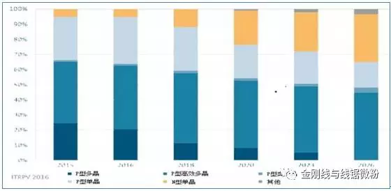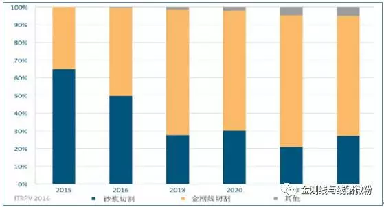 ③單晶硅切片市場,金剛線正在快速替代傳統切割工藝。金剛線用于切割單晶硅有提高切割效率、降低材料損耗、增加出片率、減少污染等優點,因此正快速替代傳統切割工藝。據 ITRPV預測,2018年之后,在單晶硅切片市場,金剛線切割工藝的市場滲透率(當前市場需求/潛在市場需求)將超過 70%。單晶硅龍頭企業隆基股份已經在全廠范圍內應用金剛線切片技術。 下圖為金剛線用于單晶硅切片。④多晶硅切片市場,金剛線切割技術目前只有小規模使用。多晶硅切割使用金剛線主要有兩個技術問題,一是鑄錠晶體的異質節點會導致斷線的問題,二是金剛線切割的損傷層比較淺, 使得傳統的HF/HNO3制絨技術不能產生良好的光學性能。目前,保利協鑫等多晶行業龍頭企業已通過黑硅等技術手段較大程度上的克服了上述問題,并推出了相關金剛線切割的多晶硅片產品。根據國際光伏技術路線圖(ITRPV)2016年報告,2015年金剛線切割工藝已在多晶硅切片市場得到小規模應用,并預測未來十年應用規模將逐步增長。