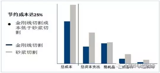 ①切割效率高。切割效率高主要來源于其技術特點:第一,金剛線采用固定方式結合金剛石,相比砂漿線處于游離狀態的磨料,不僅參與磨削切割的金剛石更多(漏損少),而且減少了磨料之間的相互磨損。第二,金剛石硬度高,耐磨損能力強,從而切削和使用壽命更長。第三,金剛線固著的金剛石的運行速度與切割線一致,而游離狀態的砂漿運行速度低于切割線。